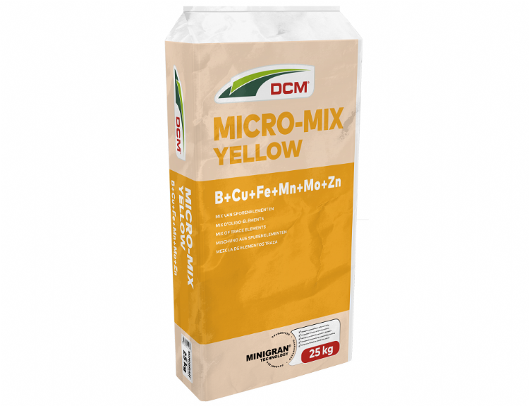 DCM Micro-Mix Yellow bevat sporenelementen en een gemengd organisch bodemverbeterend middel dat rijk is aan organische stof. De mix met Minigran-technologie werd speciaal ontwikkeld voor (container)planten die gevoelig zijn voor gebreksverschijnselen. De sporenmix is ook geschikt voor teelten waarbij een bodemanalyse een te laag gehalte aan sporenelementen aangeeft. DCM Micro-Mix Yellow is toegelaten voor gebruik in de bioteelt en wordt met succes toegepast in de containerteelt, de boomkwekerij en de sierteelt. Dankzij het mini-korreltje Minigran kan DCM Micro-Mix Yellow homogeen uitgestrooid worden, voor een perfecte verdeling, ook bij een lage dosering. Elk Minigran-korreltje bevat immers sporenelementen in dezelfde verhouding. De plantaardige grondstoffen in de DCM-mix zorgen voor een hoog organischestofgehalte. Dit vormt een tijdelijke buffer voor de sporenelementen, waardoor ze minder gevoelig zijn voor uitspoeling. De voeding wordt langzaam vrijgegeven, naargelang de behoefte van de plant. De strooibare organische sporenmix bevat boor (B), koper (Cu), ijzer (Fe), mangaan (Mn), molybdeen (Mo) en zink (Zn). Elk element speelt zijn eigen belangrijke rol voor de plant. De mix van sporenelementen biedt een oplossing voor gebreksverschijnselen die vaak gecombineerd voorkomen. Het mengsel heeft een uitgekiende verhouding, waardoor de kans op antagonisme minimaal is.