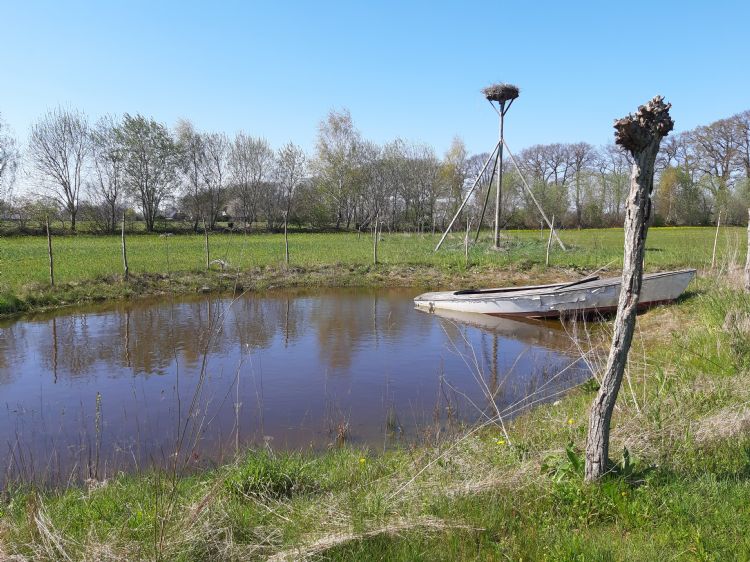 De paddenpoel, met op de achtergrond een ooievaarsnest