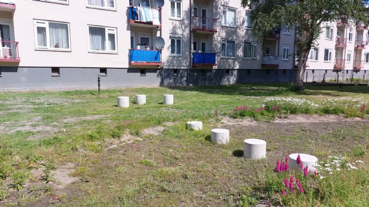 | | Betonpoefen in een grote binnentuin bij een woningcorporatie in Den Haag |