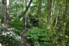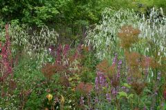 Ik zet stiekem twee cultivars onder één nummer, want uit de verte gezien hebben ze hetzelfde kleurengamma van roestbruin en oranje. Het blad van 'Marmalade' ziet er iets donkerder uit dan dat van 'Caramel'. De cultivar is goed verkrijgbaar en geeft een mooie stevige pol met golvend blad en afgeronde insnijdingen. Op de foto is een randje langs de vijver te zien in een voorbeeldtuin van Appeltern Adventure Gardens, in combinatie met Imperata cylindrica 'Red Baron'. Hij is geschikt voor particuliere tuinen. 'Maple Syrup' is een nieuwe introductie van Rijnbeek Vaste Planten die sterker, winterharder en droogtebestendiger is dan 'Marmalade', waardoor hij bijvoorbeeld goed toepasbaar is in het openbaar groen. Het villosa-bloed is te zien aan het wat behaarde blad. In 2021 is deze plant bekroond door de KVBC (Koninklijke Vereniging van Boskoops Culturen) met een bronzen medaille. De bladvorm lijkt op een die van herfstblad van een Acer met punten; vandaar de naam.