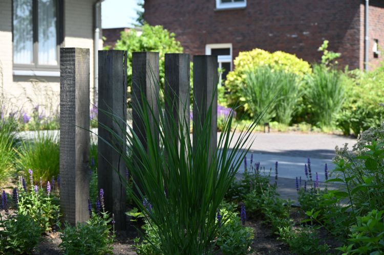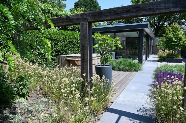 In deze tuin tref je bijvoorbeeld een pergola aan met stalen kokers en een buitendouche op maaskeien die ervoor zorgen dat het water tijdens het douchen in de grond wegzakt.