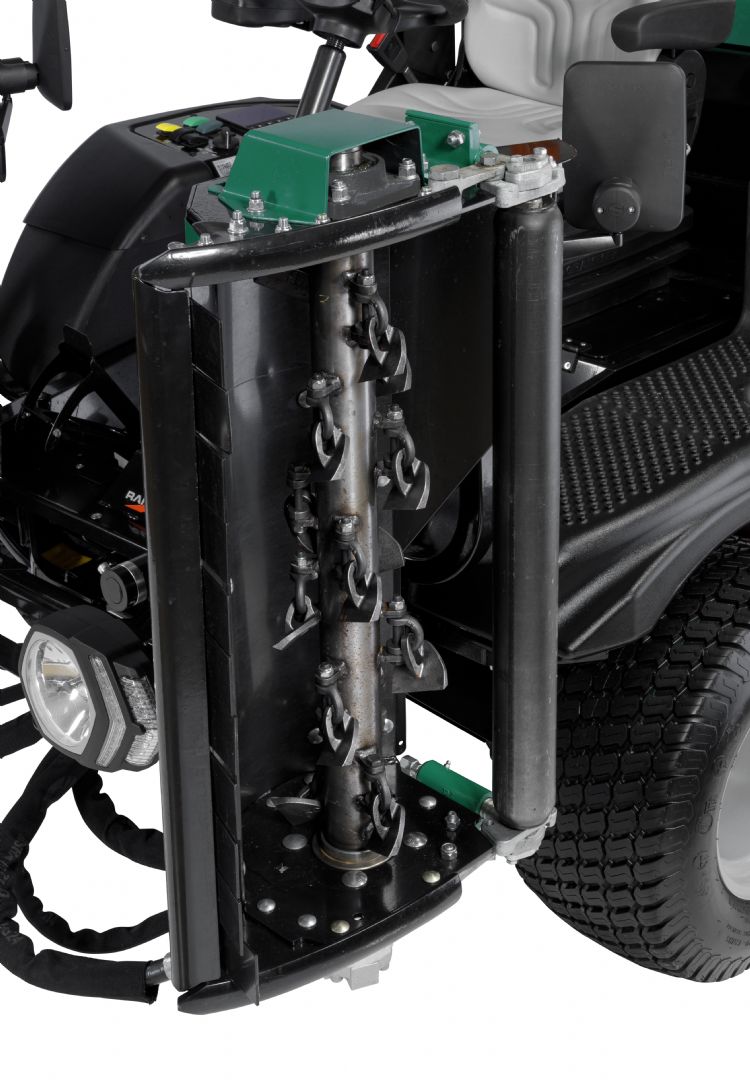 De nieuwe machine heeft volgens Zwarst het DNA gekregen van de Ransomes MP-serie: 'Het is een kleinere variant, maar heeft ook de beschikking over AdaptiCut, zeg maar de snelheidsregelaar/-begrenzing tijdens het maaien. Een traditionele machine smoort in het gras bij zwaardere omstandigheden van het gewas; deze niet. Het toerental van de rotoren blijft in die situatie behouden. De rijsnelheid neemt echter af. Allereerst behoud je hierdoor het mooie maaibeeld met de klepelunits. Verder bespaart dit brandstof en veroorzaakt dit minder slijtage aan veel machine- en motoronderdelen.' De 76 centimeter brede klepelunits kun je 'droog' aan de machine bevestigen. Dat betekent dat je voor het wisselen met bijvoorbeeld maaikooien geen slangen hoeft af te koppelen. Het blijkt dat Ransomes deze klepelunits zelf bouwt naar het ontwerp van de bekende Müthing-klepelunits. Dit is uiteraard afgestemd met deze specialist in dit marktsegment. Hierin zijn klepels toegepast die spiraalsgewijs om een rotor met een grote as-diameter zijn bevestigd. De omtrek van de klepelcilinder is 300 millimeter, wat volgens Zwarst gemakkelijk en goed maaien mogelijk maakt.