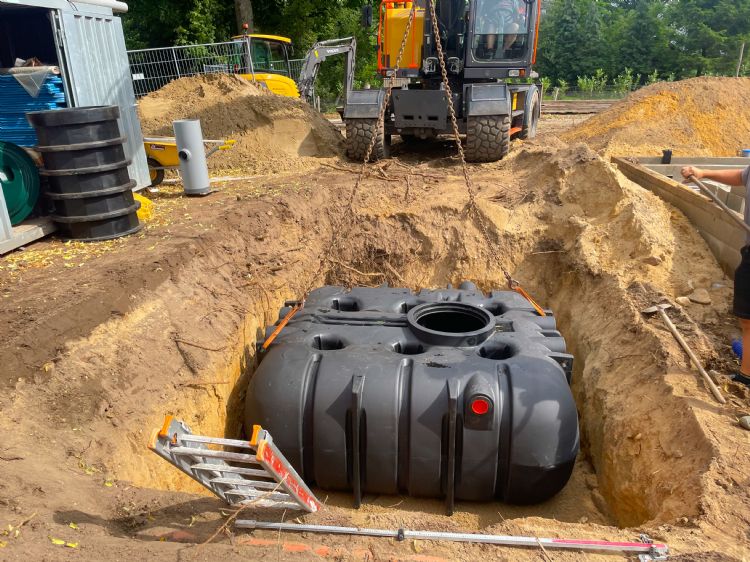 De klant wilde het regenwater graag binnenshuis gebruiken. 'Bij hergebruik van water zijn er twee opties', legt Ten Napel uit. 'Je kunt het gebruiken om de tuin te sproeien. Dan hoef je het water nauwelijks te filteren. Een groot voordeel is dat het minder kalk bevat dan leidingwater. De andere optie is dat je het opgevangen regenwater in huis gebruikt voor het doorspoelen van de wc, voor de wasmachine, de vaatwasser en buitenkraantjes. Dat was hier de wens. Dan is er meer nodig om het water te filteren.' In zo'n geval denkt Engeldot mee om te bepalen wat het beste past bij het huis, de tuin en de klant. 'Allereerst is het belangrijk om te weten hoe groot de ondergrondse tank moet zijn. Dat hangt vooral af van het dakoppervlak. Onze leverancier heeft standaardtanks van 2000 tot 6000 liter. Voor deze klant kozen we een tank van 5000 liter.' De tanks zijn van een robuust en betrouwbaar Zweeds merk. 'Een vrij plat model ook, zodat we niet te diep hoeven te graven voor het plaatsen van de tank. Dit model is 1,20 m diep, 2,60 m lang en 2,40 m breed. En bovenop zit een deksel, zodat je vanaf de grasmat toegang tot de tank houdt.'