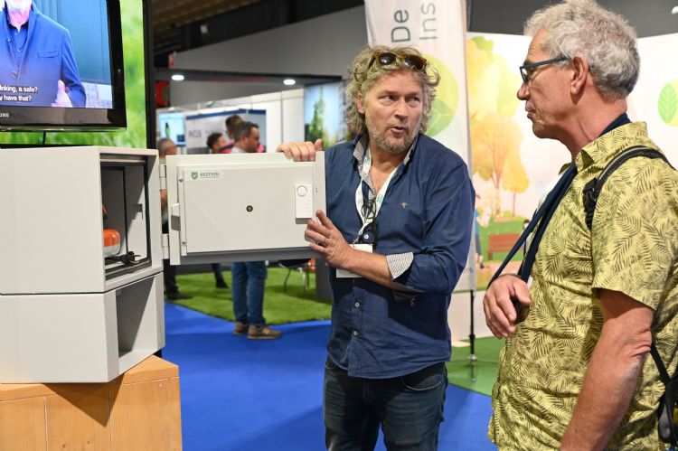 | Op de Vakbeurs Openbare Ruimte laat Remco van Kuilenburg (l) bezoekers de allernieuwste Seefion kluis zien |