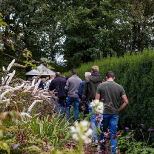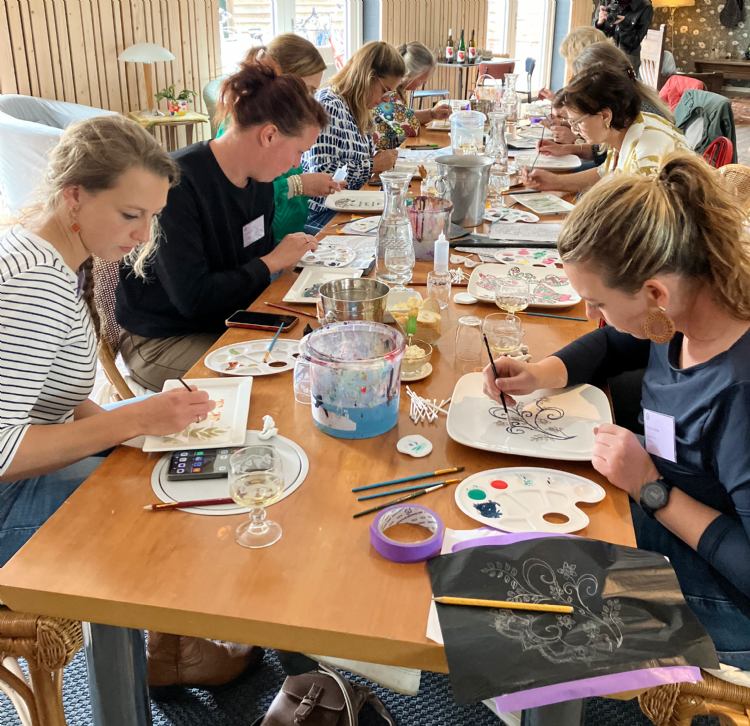 Dit jaar ging er vanuit TuinKeur een extra oproep uit naar de ondernemers om je partner mee te nemen. Westra: 'Achter iedere sterke man staat een sterke vrouw. Ondernemen doe je niet alleen, je partner is daar altijd bij betrokken. Wij waren daarom ook blij met de grote groep partners van onze leden, al dan niet meewerkend in het bedrijf die besloten mee te gaan.' De 'vrouwengroep' ging naar Wijngaard Runa, waar verteld werd over deze bijzondere locatie en aldaar ging de groep onder het genot van een wijnproeverij servies schilderen.
