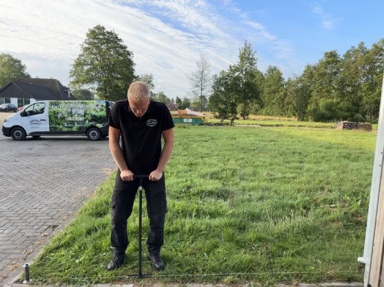 Ook Marcel Veenstra van Hoveniersbedrijf Rozengaerde in Dalfsen probeerde de Plantliner uit. Dit bedrijf verzorgt in de regio Dalfsen, Zwolle en Ommen tuinaanleg en -onderhoud en legt bestrating aan. Veenstra reageerde direct toen hij op de Facebookpagina van vakblad De Hovenier een oproep zag voor testers. Hij roemt de degelijke stalen tool en vertelt over de toepassing: 'Als je de Plantliner ondersteboven houdt, schiet er een pal los, waardoor je de nylon draad van de spoel kunt afrollen', vertelt hij. 'Je kunt hem rustig een tik met een rubberen hamer geven om hem in een vaste bodem vast te zetten. Dezelfde pal zet het afwindmechanisme vast, zodat je de nylon draad gemakkelijk kunt opspannen. We hebben er geen last van dat de draad los slipt van een metalen pen terwijl we aan het werk zijn.'