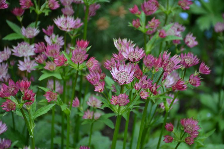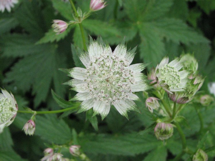 Astrantia is familie van de Apiaceae en als je goed kijkt, zie je dat de bloem een grove versie is van andere schermbloemigen zoals fluitenkruid. Het blad, daarentegen, is grof ingesneden, terwijl de meeste schermbloemigen een dubbel ingesneden blad hebben, soms zelfs driedubbel. Groot sterrenscherm, zoals de Nederlandse naam officieel luidt, houdt van een niet te droge, liefst kalkrijke bodem. Op andere grondsoorten groeit de plant wel, maar op veengrond, bijvoorbeeld, geeft hij veel blad en minder bloemstelen. Vaak wordt het blad dan ook snel lelijk gedurende het groeiseizoen. Zandgrond met een lage pH (zuur) die matig voeding biedt, is ook niet ideaal. Er ontstaan snel droogteranden langs het blad.
