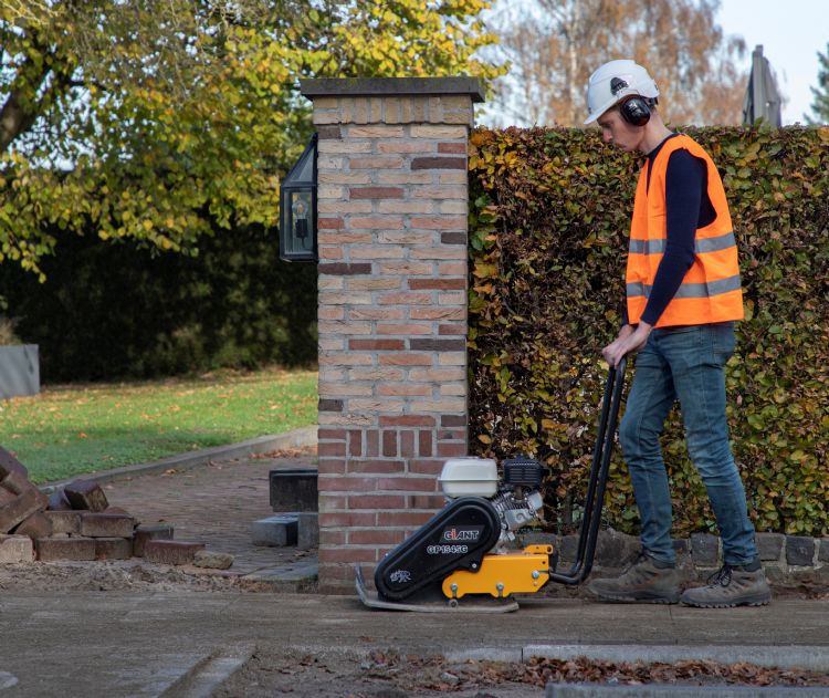 De GIANT GPR3558G-schakelplaat -zijn zwaarste, dus - zet Vermeer vooral in om na het uitgraven van de grond het opgebrachte zand en/of puin strak te verdichten, zoals bij de aanleg van een oprit naar een carport. De werkbreedte van deze machine is 58 cm, met een slagkracht van 35 kN en een slagfrequentie van ruim 80 Hz. Hiermee is het geen probleem om aangelegde bestrating gelijkmatig af te trillen, waarbij je niet snel iets beschadigt, volgens Vermeer: 'De machine laat zich goed sturen', vertelt hij. 'Voor zeer zwaar belaste opritten heb je echter nog zwaardere trilmachines nodig. Die huren we dan in; dat gebeurt een enkele keer per jaar. Voor het serieuze, zwaardere straatwerk, dus met een flink aantal vierkante meters, huren we gespecialiseerde bedrijven in. Mijn schakelplaat weegt 185 kg. Bij transport zetten we hem in de laadbak van mijn GIANT-loader. Daarmee kunnen we hem op de aanhanger zetten en eventueel ook met een graafmachine lossen.'
