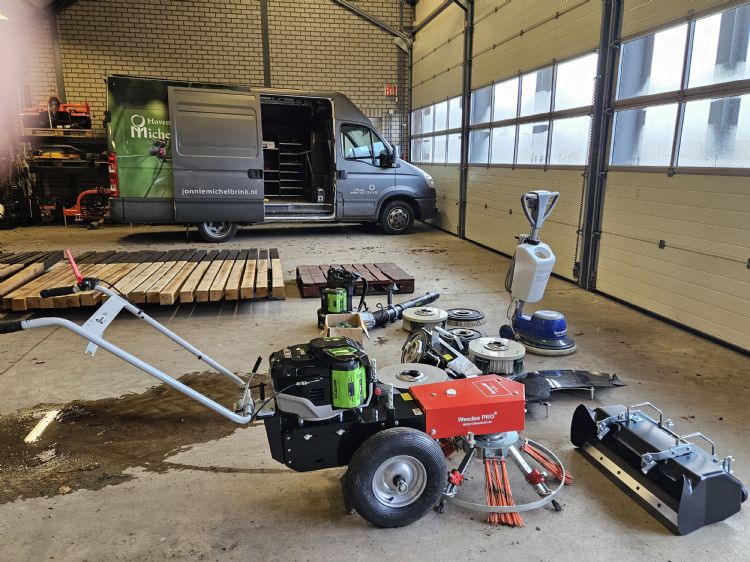 Jonnie Michelbrink, eigenaar van Hoveniersbedrijf Michelbrink, werkt al enige jaren met veel genoegen samen met Terrazza MC. Hij kwam ruim vier jaar geleden tijdens een plaatsersdag van een stenenleverancier in contact met de Belgische specialist die er een demo met een Terrazza TMC-terrasreiniger gaf. 'Ik was hierover meteen erg enthousiast,' herinnert Michelbrink zich. Hij schafte een terrasreiniger aan en gebruikt hem al die tijd naar alle tevredenheid. Vervolgens kwam Michelbrink eerder dit jaar in aanraking met de nieuwe Weedee PRO-onkruidverwijderingsmachine, ook van Terrazza MC. De gemakkelijk hanteerbare en wendbare Weedee PRO-machine kan gebruikt worden op allerlei verharde oppervlakken, zoals terrassen, opritten, parkeerplaatsen en voetpaden die uitgevoerd zijn in materialen als beton, bakstenen, kasseien, klinkers en asfalt. Een groot pluspunt is dat de Weedee PRO-machine multifunctioneel is dankzij het systeem van de verwisselbare borstels.