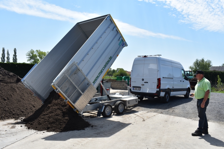 De vele bijzondere eigenschappen van deze TwinTrailer zullen het werk van de hovenier enorm veraangenamen. Het grootst en opvallendst is dat het materieel voor een klus heel gemakkelijk op de trailer kan worden gereden. De twee dubbelscharnierende en met gasveren ondersteunde achterdeuren gebruik je daarbij om een brede oprijhelling te bouwen. Geen gesleur meer met zware, onveilige oprijplaten. Vervolgens kun je met een kleine hydraulische cilinder op de trekdissel heel vernuftig de kipwagenbodem laten hellen, tot maximaal 10 graden. Vervolgens kan de minigraver of miniloader veilig en in één lijn op de aanhanger worden gereden. Zelfs machines zonder een eigen rijaandrijving, zoals een houtversnipperaar, kun je zo in je eentje over de flauwe helling op deze aanhanger rijden. Ook het beladen met groenmassa met een kruiwagen of een miniloader gaat heel gemakkelijk. Er is zelfs aan de voorzijde een plekje gereserveerd voor een kleine graafbak. Eenmaal weer leeg, is de TwinTrailer met zijn modulair afneembare en verstevigde aluminium voor- en zijschotten ook beschikbaar als kipwagen. Het maximale volume is circa elf kubieke meter. Uiteraard moet je eerst wel even de bodem vlak stellen en de deuren weer sluiten. Vervolgens kan de hovenier hem naar wens vullen met houtsnippers, takken en ander materiaal. Binnen enkele seconden is de TwinTrailer weer klaar voor een nieuwe opdracht.