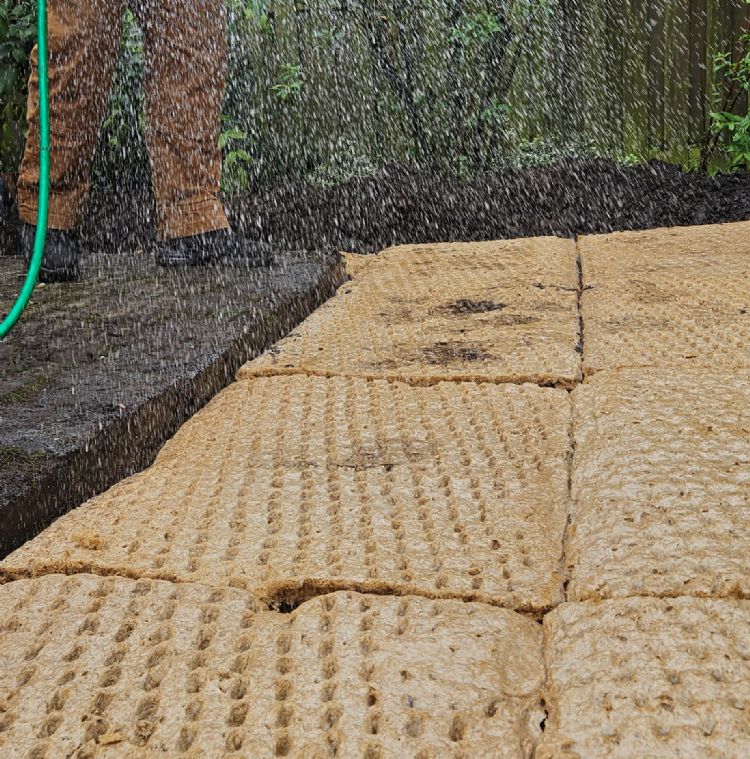 De waterplaat waarover Hazekamp het heeft, is een in Duitsland geproduceerde plaat, gemaakt van rogge, leem en houtvezel. 'Deze plaat heeft als eigenschap dat hij 12 liter water per vierkante meter kan absorberen. Bij elke watergift of regenbui neemt de plaat water op, dat wanneer het nodig is weer wordt afgegeven aan de wortel. Dat gaat vanzelf, aangezien de plantwortels de waterplaat doorwortelen.'
