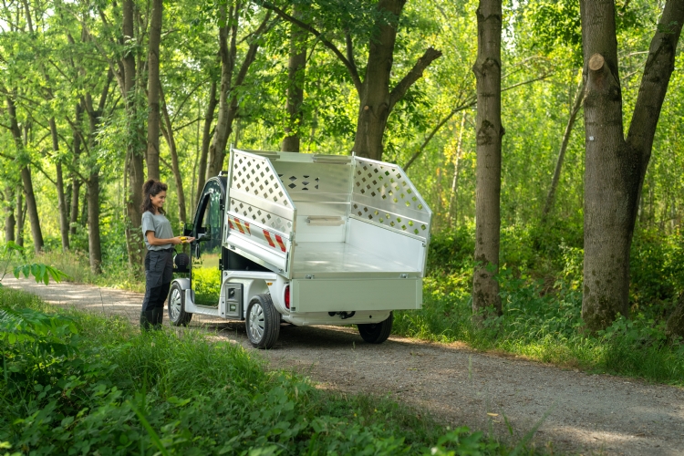 | | Het Ligier-bedrijfsvoertuig hier is voorzien van kantelbare zijwanden. |