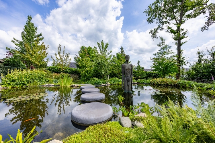 Centraal in de tuin -en echte blikvanger- is de vijver met stapstenen, vlonder en de waterschalen. Het water leeft, maakt geluid, beweegt, spiegelt en trekt vogels, reptielen en insecten aan.