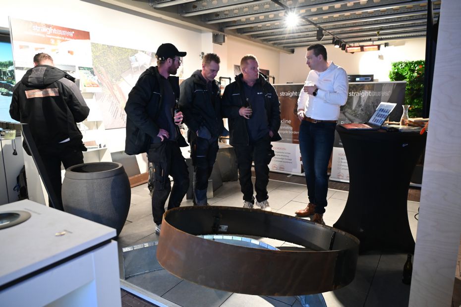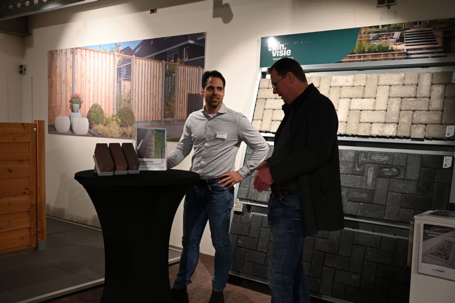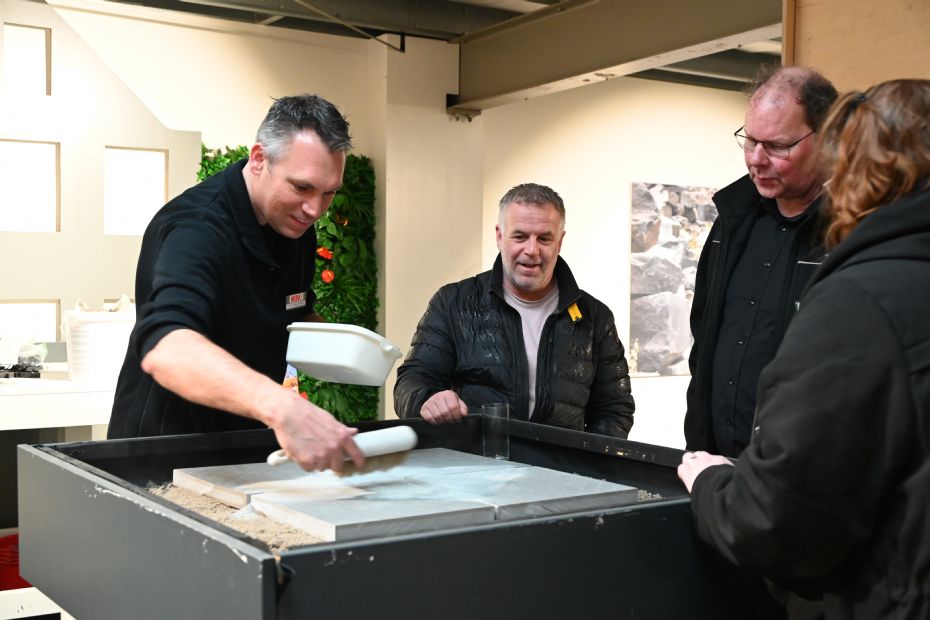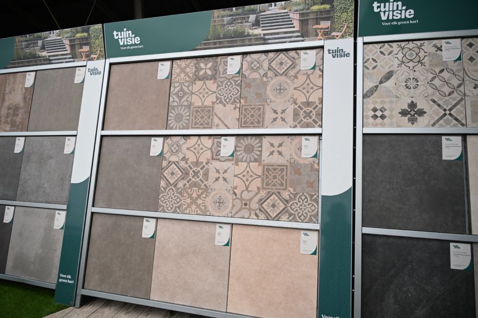 Zo draaide op de eerste verdieping Pierre Wezendonk van Wedox diverse demo's met zijn voegmiddelen. Het jonge bedrijf is vanaf maart dit jaar verkrijgbaar bij Tuinvisie en komt in de plaats van de eigen voegmiddelen. Accountmanager Roy Gijsberts: 'Het is een beter product met een betere marge voor de hovenier. Daarom zijn we overgestapt.' Nieuwe geprinte betontegelIn de demotuin was ook de nieuwe betontegel van Tuinvisie te bewonderen. De Passiona-lijn wordt uitgebracht in vier verschillende kleuren, inclusief een mozaïektegel speciaal voor onder het terras. Opvallend is dat de lijn volledig bestaat uit warme beige tinten. Gijsberts merkte op: 'Helemaal passend bij de Ibiza-tuintrend.'