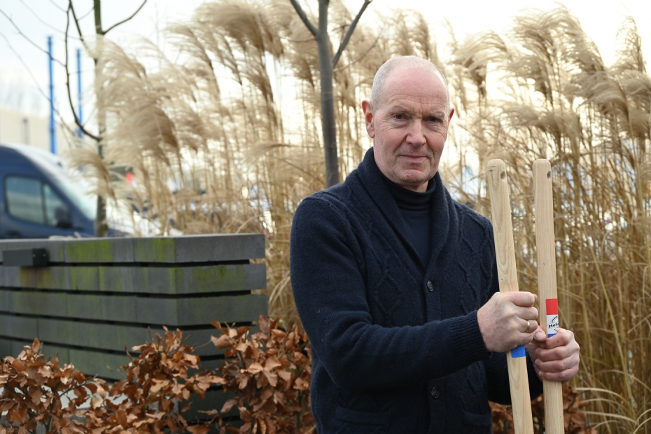 Het blijkt om een dubbele spade te gaan waarmee je putten kunt graven, om daarin bijvoorbeeld een dikke paal te plaatsen. De producent, DeWit Tuingereedschappen, heeft dit attribuut de naam palenzetter gegeven. Paul de Rijk hoorde dit gesprek met mijn collega en meldde dat hij een zeer tevreden gebruiker van dit gereedschap is. Paul de Rijk Hoveniers is een bedrijf in het Zeeuws-Vlaamse Oostburg, dat zich met aanleg en onderhoud voornamelijk richt op tuinen, terrassen, veranda's en vijvers. De eigenaar is de enige medewerker, maar ooit telde zijn onderneming tien personeelsleden. De Rijk: 'Met al dat personeel hield ik me meer bezig met opdrachten binnenhalen, aansturing en planning dan met het echte hovenierswerk. Ik voelde me meer regelaar dan hovenier en dat begon me op enig moment tegen te staan. Uiteindelijk ben ik alleen verdergegaan.'