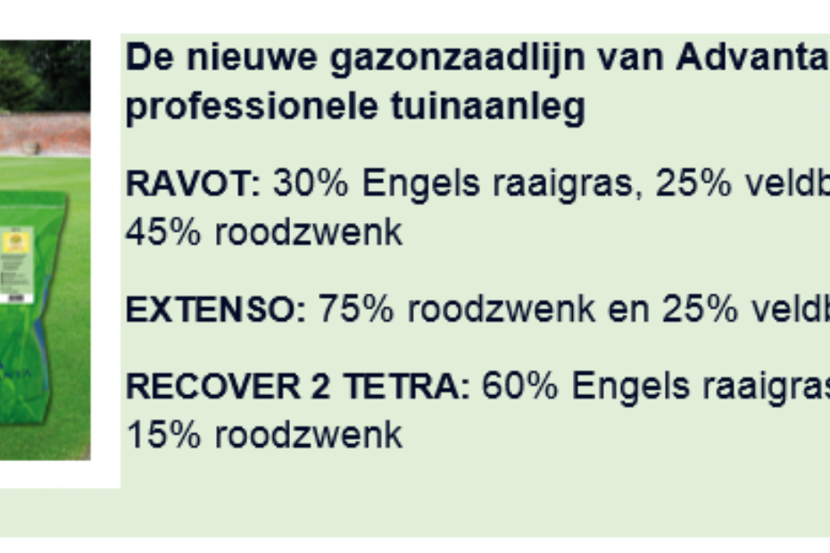Voor nieuwe aanleg voorziet de graszaadlijn van Advanta in oplossingen voor speelgazons, siergazons én een gazonoplossing voor moeilijke plekken, zoals schaduwrijke en droge plekken. Steunenberg: 'Visueel doet ons Ravot-speelgazon niet onder voor een bezode mat. Het aandeel van 45 procent roodzwenk zorgt voor een even dichte en fijnbladige zode. Door de combinatie met 55 procent Engels raai en veldbeemd is het gras bovendien robuust en sterk; een robbertje stoeien of andere intensieve betreding verdraagt het dan ook met gemak. Wij classificeren het als een multifunctioneel gazon voor de veeleisende gebruiker, met snelle vestiging en relatief makkelijk onderhoud.' Als de voorkeur uitgaat naar een echt sfeer- of siergazon, dus als de esthetische waarde belangrijker is dan de gebruikswaarde, komt Extenso in beeld. Hierin domineren traag groeiende roodzwenken en veldbeemd; Engels raaigras zit er niet in. Het resultaat is een fraaie zomer- en winterkleur en een lagere maaifrequentie. Tegelijkertijd is het ook de aangewezen samenstelling voor de inzaai van schaduwrijke en droogtegevoelige plaatsen; denk aan gazons met veel bomen en struiken rondom, die vocht wegtrekken en zonlicht tegenhouden. De soorten in Extenso hebben de beste tolerantie voor deze moeilijke groeiomstandigheden.