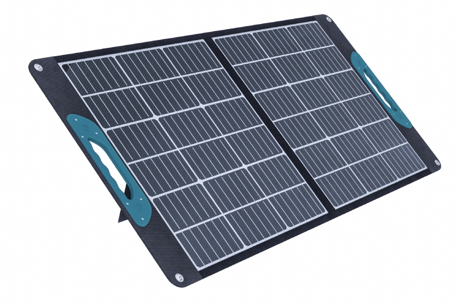 Zonnepanelen Johan Teeuwen: 'Op deze unit kunnen in totaal twee zonnepaneelunits worden aangesloten, zodat er tijdens de werkzaamheden of zelfs tijdens het gebruik van het vermogen van de unit bijgeladen kan worden om de autonomie verder te verlengen. Een zonnepanelenset met 2 panelen heeft een capaciteit van 100 W continu bij optimale zonnige omstandigheden.'