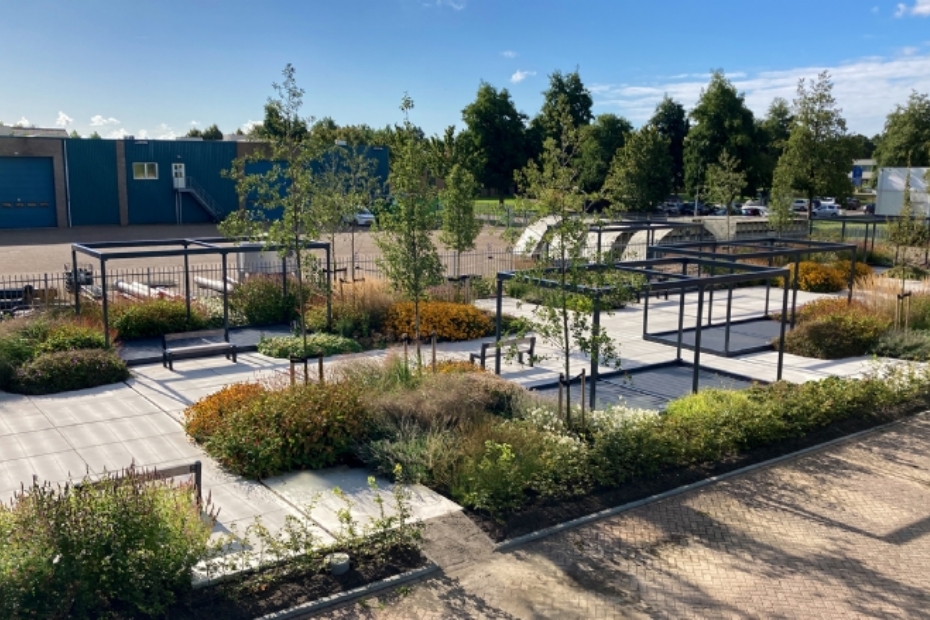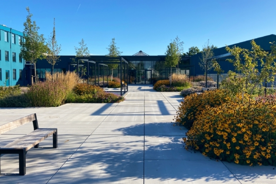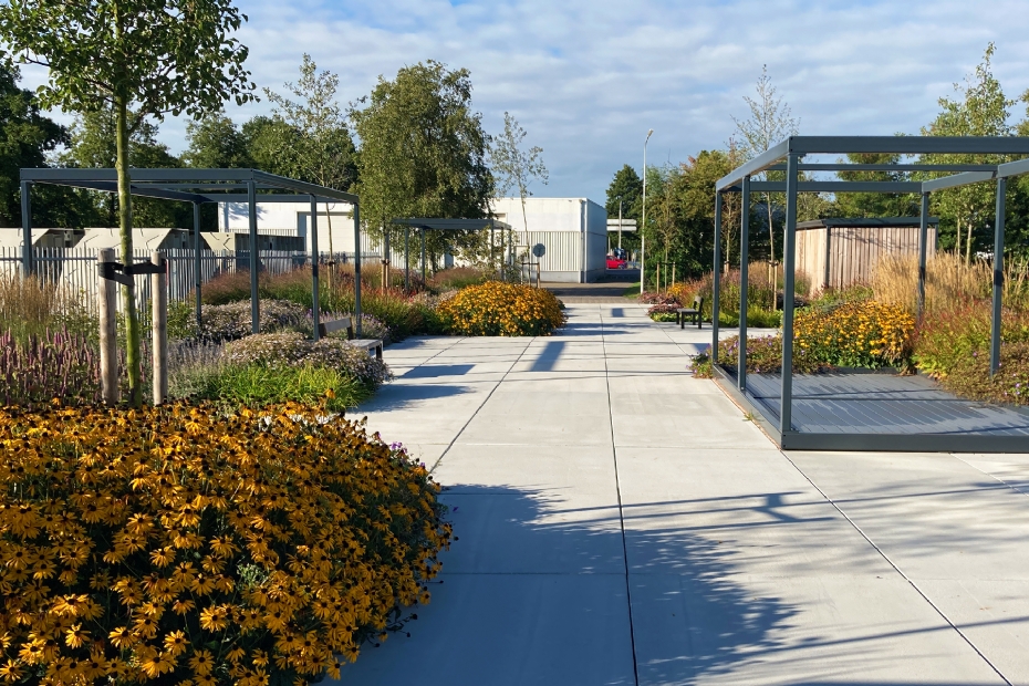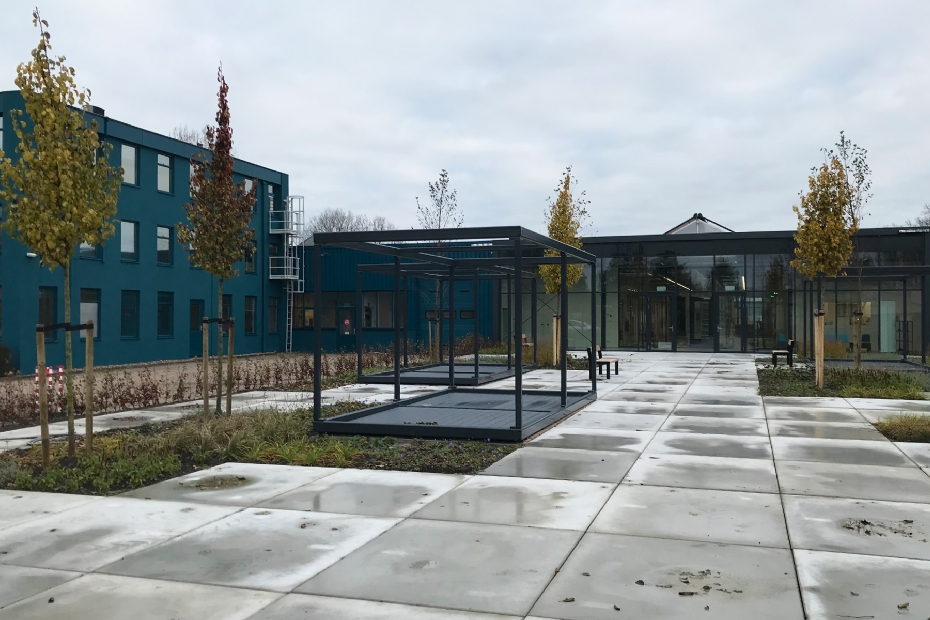 Donker ging met de wensen van Paques aan de slag. “Het tuingedeelte is zo’n 120 x 50 meter groot”, vertelt Wierd Kramer, commercieel adviseur bij Donker. “Betonnen vloerplaten, zogeheten ‘stelconplaten’, zijn de basis van ons ontwerp. Voortbordurend op de bouwkundige visie van Gear architecten – de ontwerpers van het gebouw – zijn de platen in het verlengde van de glazen panelen van het pand gelegd. Zo ontstaat er een mooi lijnenspel. Speels verdeeld over de hele oppervlakte hebben we vijf open ‘hubs’ geplaatst: multifunctionele plekken voor ontmoeting en overleg. Ook staan hier en daar duurzame zitbanken.”