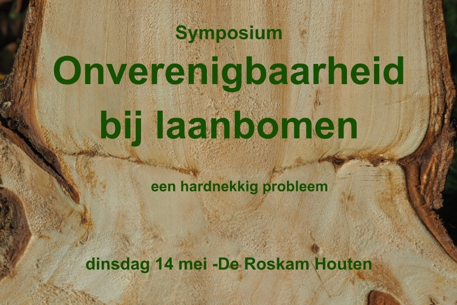 Op dinsdag 14 mei organiseren de vakbladen Boomzorg en Boom in Business bij De Roskam in Houten een symposium over onverenigbaarheid bij laanbomen. Met bijdragen van Ronnie Nijboer (Noordplant), Daniël Deinum (Naktuinbouw), Luuk Boender (Terra Nostra), Henk van Eldik (Tree-o-Logic), Jilles van Zinderen (Monge Legal), Marc Ravesloot (WUR) en Niek Vernooy (Groenadvies Amsterdam). Let op: Het symposium is volgeboekt, aanmelden is niet meer mogelijk.