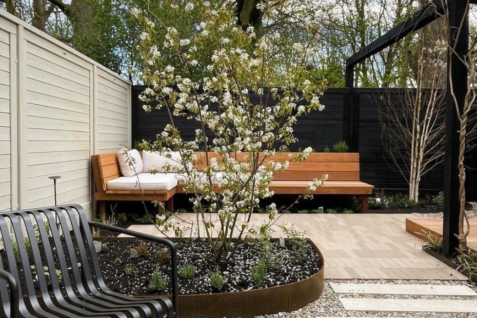 Kelvin Bosman stipt een ander tuinproject aan, waarbij een hardhouten maatwerkbank is geplaatst. Het bankiraiframe, dus de balken en rugleuning, heeft Van Dorp Hout uitgetekend en gemaakt. 'Wij hebben zelf de palen in de grond geslagen en de bekleding aangebracht. In feite nemen we halffabricaten af, wat ons veel tijd scheelt op het project. Daarnaast is er een pergola van zwartgeverfde douglas en een vlonder van bankirai in het project verwerkt.'