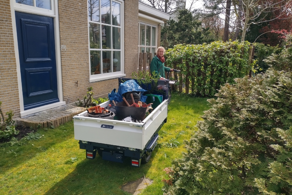 Rozemarijn Oosthoek gebruikt al geruime tijd een fietskar voor haar hovenierswerk op ecologische basis. 'Ik heb de opbouwbak zelf ontwikkeld', vertelt ze. 'De stang van mijn kar koppel ik aan een punt onder het fietszadel. Ik beweeg me voort met een traditionele fiets met zeven versnellingen. In de bak vervoer ik hoofdzakelijk hoveniersmateriaal dat ik nodig heb voor snoeien en grondbewerking. De aanvoer van grote hoeveelheden compost laat ik mijn opdrachtgevers meestal zelf verzorgen. Wel vervoer ik het plantgoed van een ecologische kweker met de fietskar naar mijn opdrachtgevers. In combinatie met een gewone fiets is een zwaarbeladen fietskar fysiek best wel belastend. Bij bruggetjes, zoals ik in Delft tegenkom, moet ik het geheel duwen, en tegenwind op vlakke open terreinen is al helemaal geen pretje. Daarom was ik me aan het oriënteren op een elektrische fiets.'