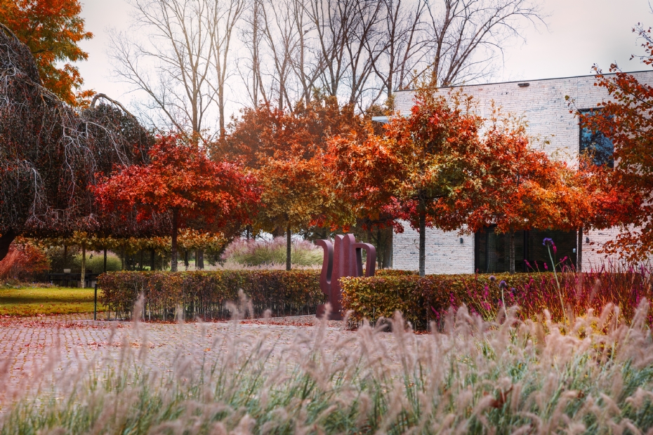 'Speels verdeeld over de hele oppervlakte hebben we vijf open "hubs" geplaatst: plekken voor ontmoeting en overleg. Ook staan hier en daar duurzame zitbanken.' Ook het paarsblauwe kattenkruid is goed vertegenwoordigd: een knipoog naar het blauwe bedrijfslogo van de opdrachtgever. Om tuinonderhoud te beperken, werden bodembedekkers aangeplant. 'Elk bloeiseizoen bloeit er wel iets, een prachtig gezicht', zegt Kramer. 'Op den duur zullen de jonge bomen - elzen, sierperen en krentenbomen - voor schaduw zorgen.'