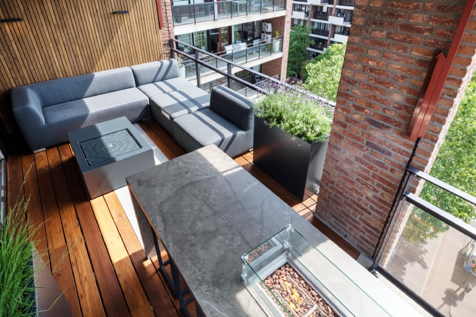 Hoog boven het bruisende centrum van Eindhoven vinden we ons eerste project, een balkon. Nauwelijks 20 m2 groot en toch van alle gemakken voorzien. De lounge en de bar zijn voor dit balkon op maat gemaakt. Door op sommige zitelementen de rug weg te laten blijven de zichtlijnen op de stad aanwezig. De grote keramische tegels die in de vlonder zijn opgenomen lopen naadloos over in de bar. Mooi detail: de zitting van de barkrukjes is van dezelfde stof als de lounge. Er is door ontwikkelaar Sparq Tuinen gekozen om de vier elementen terug te laten komen. Hoog in de lucht hebben ze de overige drie elementen toegevoegd. Aarde in de plantenbakken waar de siergrassen wuiven en de lavendel geurt in de zomerse avondzon. Water loopt speelt over de rand van de tafel in een verborgen reservoir, en in de bar is een vuurelement opgenomen. Sfeervol en het verwarmt de 'barhangers' die ver kunnen uitkijken over de skyline.
