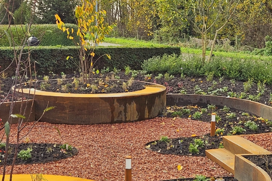 | | Voor de ronde vormen zijn cortenstalen keerwanden van Adezz gebruikt. |