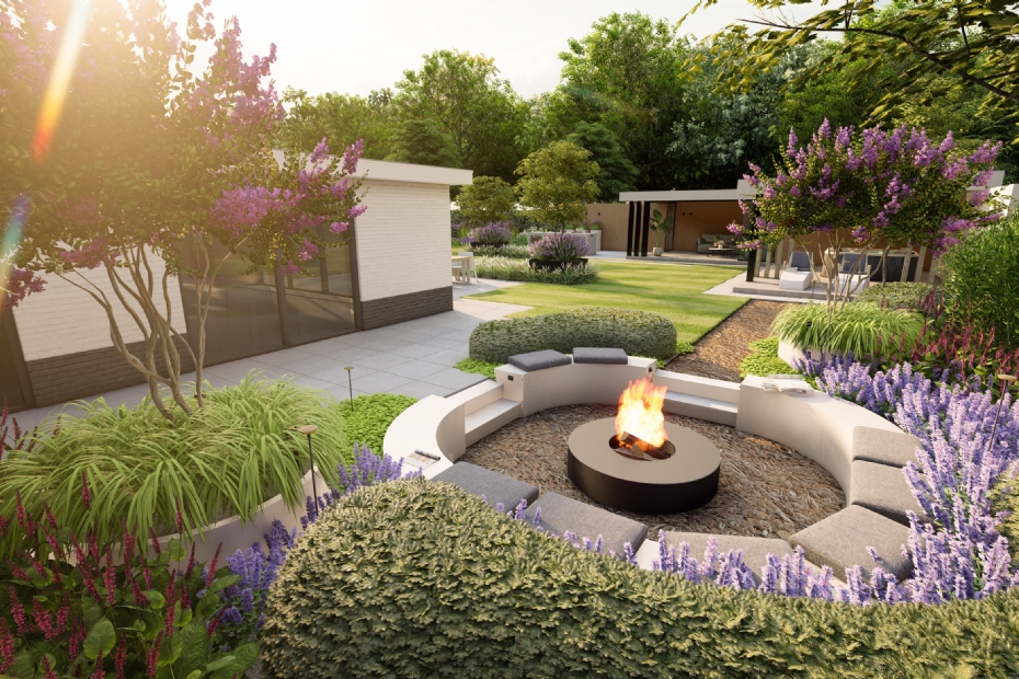 | | De zitkuil neemt een prominente plaats in in het ontwerp van deze tuin met buitenverblijf in Oud Gastel. |