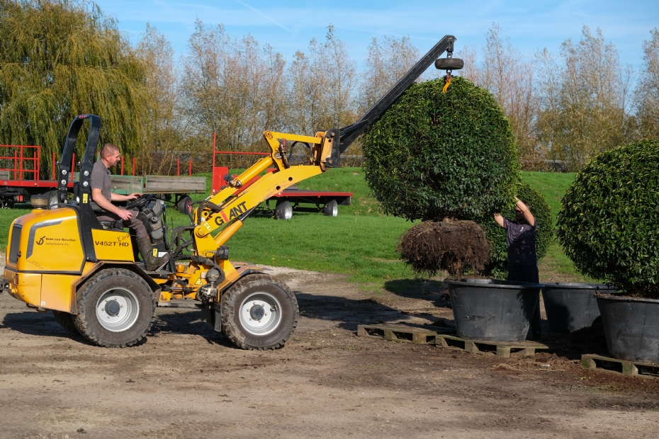 'Wij zetten de solitairen in de pot, zodat ze 's zomers ook geplant kunnen worden. We zijn daar heel druk mee, want rond deze tijd gaan ze de verkoop in. Ook bij de solitairen hebben we een breed assortiment, zoals Prunus, Amelanchier, Koelreuteria en Paulownia. Dit zijn slechts enkele voorbeelden; het kan goed zijn dat er wel honderd soorten populair zijn. Morgen kan het weer anders zijn. We hebben genoeg planten staan om aan de vraag te voldoen. Het kan gaan om gewassen van vijf jaar oud, maar ook van vijftien jaar. De hovenier kan de juiste boom ter plekke uitzoeken. Alles is mogelijk; we zetten het bestelde plantgoed klaar, laden het in of bezorgen het,' benadrukt Van Oirschot nog maar eens.