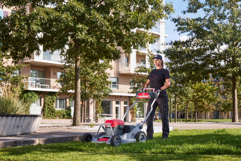 De 82V-li-ionaccu's leveren hun energie aan liefst twee mesmotoren en aan de twee onafhankelijke, geïntegreerde hubmotoren. Die zijn in de achterwielen geplaatst. Teeuwen: 'We merken bij EuroGarden dat de gebruikers in de branche qua accuoplossingen nog altijd onzekerheden hebben qua autonomie en kracht. Maar ik kan ze garanderen: hij is heel krachtig en hij trekt de 85 kilo gewicht met gemak een talud op. Daar hebben ze bij Cramer goed over nagedacht. Sjorren aan de machine als je op een talud staat, is verleden tijd. De machine is zelfs voorzien van een aandrijving achteruit. En wat accu's betreft: met totaal drie slots zijn daarin vele mogelijkheden. En net als bij een lege brandstoftank moet je voor een nieuwe accu even stoppen. Die accu's passen overigens ook in vele ander Cramer-machines.'