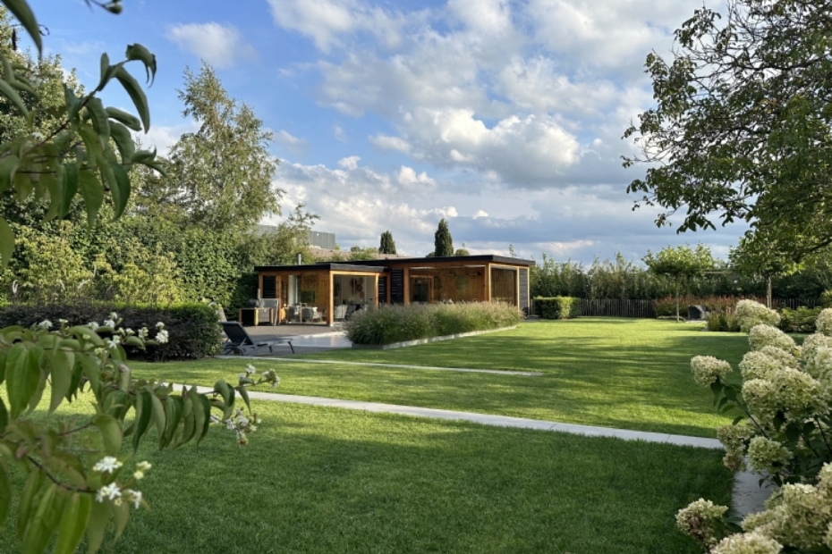 De visie voor deze tuin is om moderne lijnen te combineren met een landelijke sfeer. De tuin is ruim opgezet, waardoor de landelijke en moderne sfeer nog meer tot uiting komen.