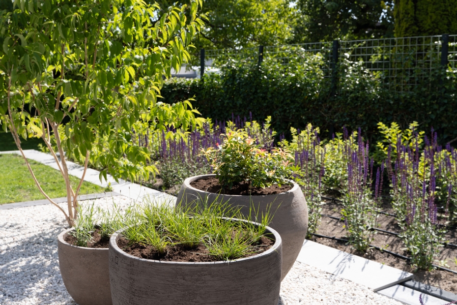 De exclusieve, unieke plantenpotten van ‘Atelier Vierkant’ zijn echte blikvangers in de tuin. De groene beplanting komt hierin goed tot zijn recht. Door de robuuste afwerking passen ze goed binnen het ontwerp. De plantpotten komen op verschillende plekken terug in de tuin.