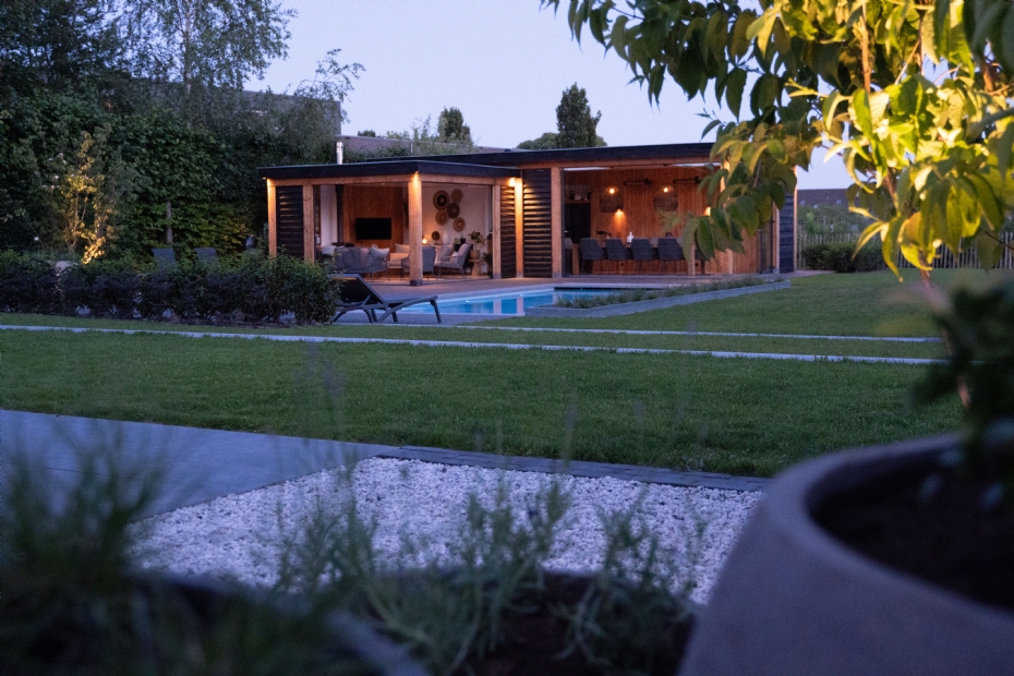 Ook het hoogteverschil (een verloop van vijftig centimeter) versterkt dit gevoel. De tuin, gerealiseerd door Ruinard Hoveniers, is niet alleen aantrekkelijk voor het oog, maar ook praktisch. Er kan op verschillende manieren genoten worden van de tuin. Samen ontspannen en dineren of een frisse duik op warme dagen.