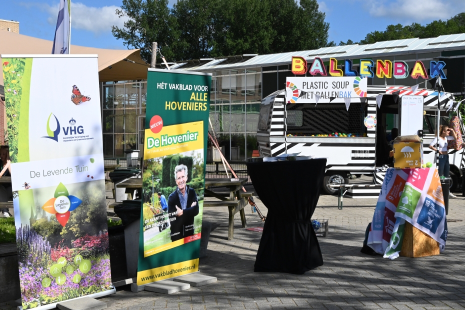 Op het schoolplein vond je de beursvloer met bedrijven zoals De Enk, Vasteplantenkwekerij Lageschaar, Jub Holland, Koninklijke VHG, Boomkwekerij Boot & Dart, Medigran en uiteraard Vakblad De Hovenier.