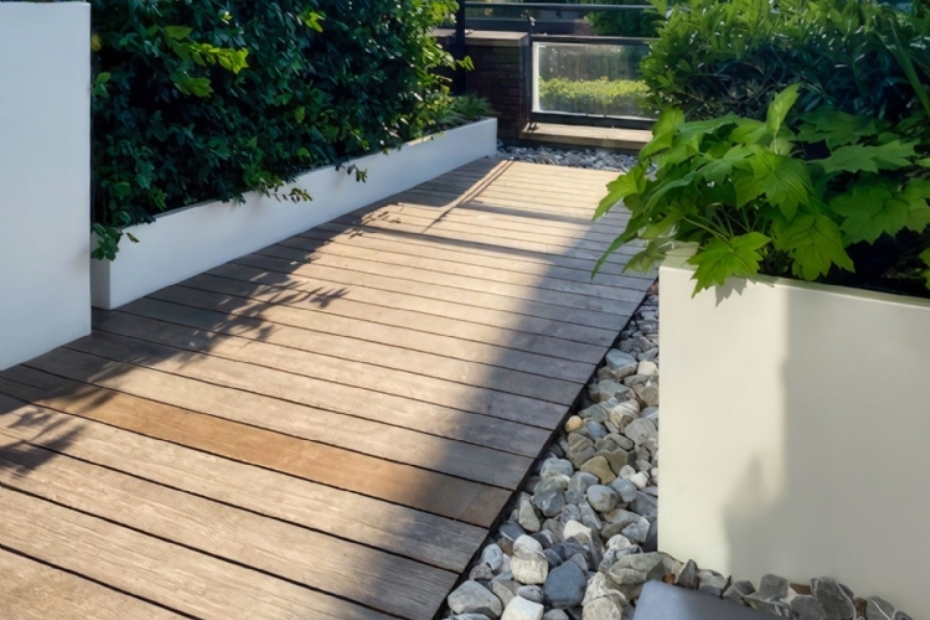 Een moderne daktuin met luxe materialen maakt een groenrijke oase op hoogte. Deze verfijnde buitenruimte belichaamt luxe en comfort op hoog niveau.