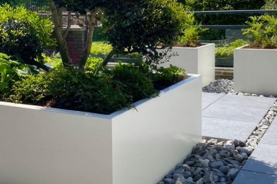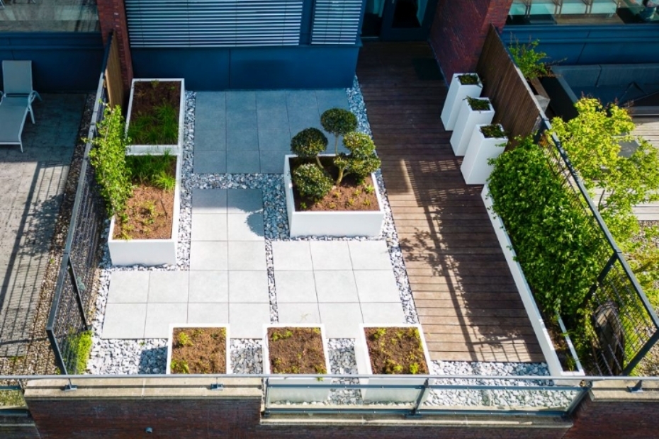 Het groen in de daktuin wordt gecombineerd met verfijnde plantenbakken en decoratieve elementen. Luxe plantenbakken vervaardigd uit materialen als gepoedercoat aluminium voegen een vleugje elegantie toe aan de tuin.