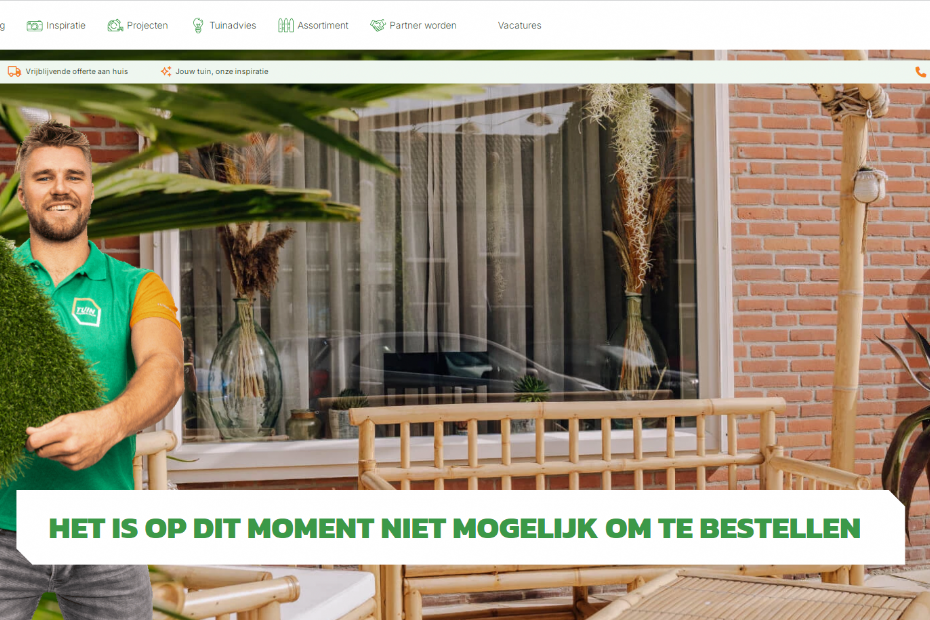 | Screendump van de website van Tuinmaterialen.nl, hieruit blijkt dat bestellen op dit moment niet mogelijk is bij het bedrijf. |