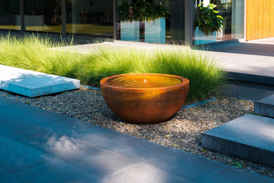 Adezz introduceert een nieuw waterelement: de Bayou. Het water kabbelt rustig over de rand van deze robuuste ronde watertafel.