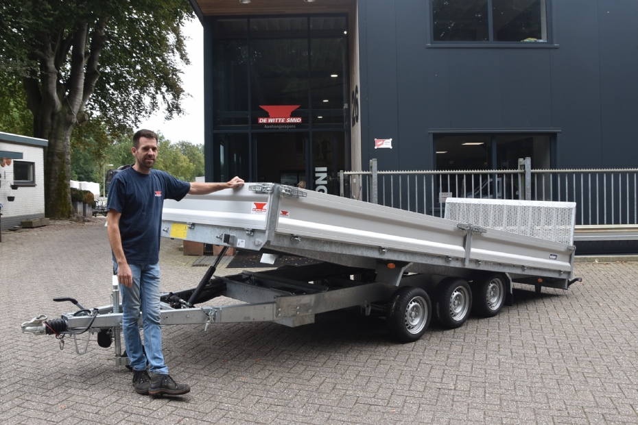 We nemen even een kijkje in de opslagloods. Koop: 'Ook als een hovenier of stratenmaker een vierassige plateauwagen nodig heeft, kan De Witte Smid die leveren. Maar ook aanhangwagens die driezijdig kunnen kippen, of die een verlaagde kipbak hebben tussen de wielen. Bij een dergelijk type heb je geïntegreerde rijplaten om er een voertuig op te rijden. Iets dergelijks is ook bij de TwinTrailer mogelijk, waarvan we dealer zijn. We leveren qua kippers maar liefst vijf formaten met binnenwerkse lengtematen van 251 centimeter tot 414 centimeter. Ook de last die je met een aanhangwagen kunt vervoeren, is van belang bij de gebruikers. Ruwweg kennen we een indeling in vier categorieën. Dat begint met een brutolaadvermogen van 750 kilo. In de zwaarste categorie zitten aanhangers met een brutolaadvermogen van 3000 tot en met 3500 kilo. En als je een aanhanger met een moversysteem wilt kunnen verplaatsen? Dan kunnen we dat als accessoire op de wielen monteren, compleet met radiografische besturing.'