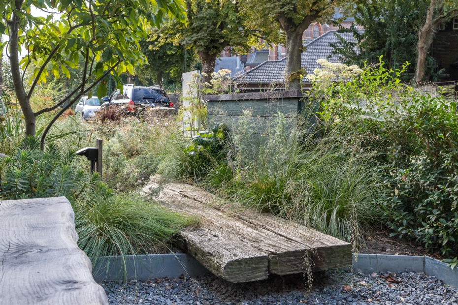 'In het ontwerp hield ik niet alleen rekening met het milieu, maar ook met het veranderende klimaat. Vrijwel alle materialen zijn hergebruikt en een derde van de beplanting is inheems. Bomen zoals de kastanje zorgen op warme zomerdagen voor verkoeling in de tuin én in de woning. Het ontwerp bestaat uit heldere strakke lijnen die doorlopen in de hagen, muurtjes en de bestrating van de oprit. De weelderige beplanting verzacht de harde lijnen.' Poppelaars gebruikte veel vaste planten en siergrassen. 'Uit milieuoogpunt heb ik bewust zoveel mogelijk inheemse planten gebruikt. Denk aan duizendblad, grote graslelie, veldsalie, wildemanskruid en muskuskaasjeskruid. Ik heb ook gekeken naar planten die CO2 opnemen. Het onderhoud is minimaal, omdat de bodem vrijwel gesloten is en onkruid weinig kans krijgt.' De hergebruikte materialen bestaan onder andere uit koperslakkeien. 'Deze heb ik verwerkt in de oprit. Voor het verhoogde vlonderpad naar het zitgedeelte zijn hardhouten balken gebruikt die afkomstig zijn uit een bruinkoolmijn in Zuid-Limburg. Het beschutte zitgedeelte bestaat uit olivijnsplit, dat de eigenschap heeft CO2 aan zich te kunnen binden.'