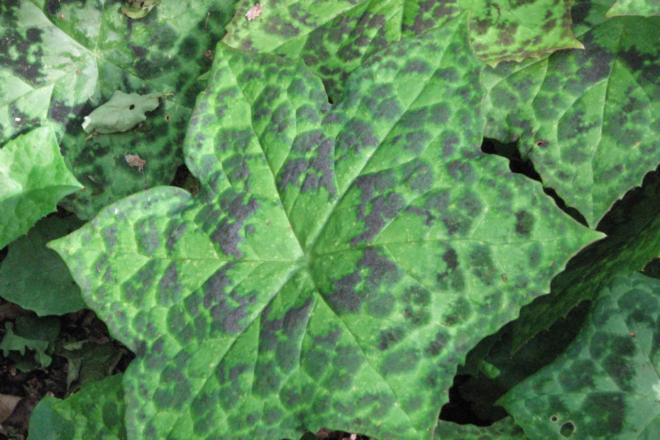 Alleen al vanwege de naam zou je hem kiezen! Deze plant, met de Nederlandse naam voetblad, heeft zeskantig blad met onregelmatig geplaatste donkere vlekken, die leuke accenten geven. Hij is ooit geïntroduceerd door het bekende Noord-Amerikaanse bedrijf Terra Nova. De plant wordt door weefselkweek vermeerderd. Dat is op zich geen probleem, maar daardoor is hij wel iets duurder in aanschaf. Gelukkig heb je er maar drie per vierkante meter nodig. De donkerrode bloemen hangen onder het blad; je moet dus je best doen om ze te zien. Later worden het grote vruchten, 4 tot 6 cm groot, wat flink is voor een vaste plant. De plant is familie van Berberis.