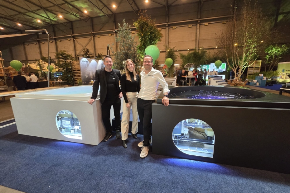 Lucien Douwes van Drop, Myrthe en Thomas Jacobs van Poolmotive. Drop is een Finse spa in een vorm van druppel, gefocust op minimalistisch design. Eerste keer op de MidT, en heeft al leuke belangstelling ontvangen. Poolmotive was de eerste dealer in Nederland van Drop, die het design omarmde.