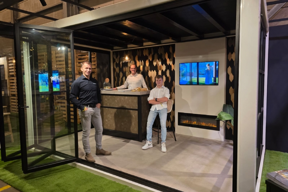 Jacob de Vries, Remco Keijzer en Peter de Vries van vanBach. Ze tonen op Meesters in de Tuin vouwwanden voor binnens- en buitenshuis, buitenverblijven etc.