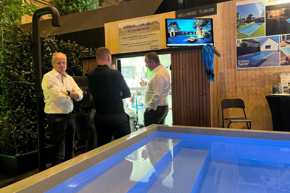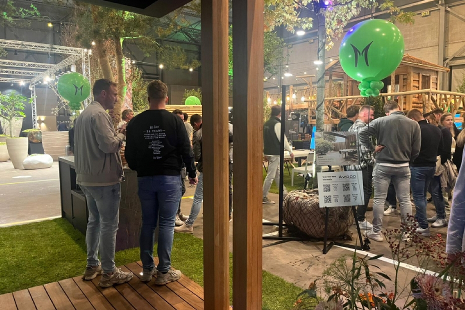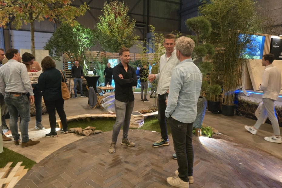 Drukte op de gezamenlijke stand van Dutch Luxury Garden Concepts, Veraluxe en In-lite.
