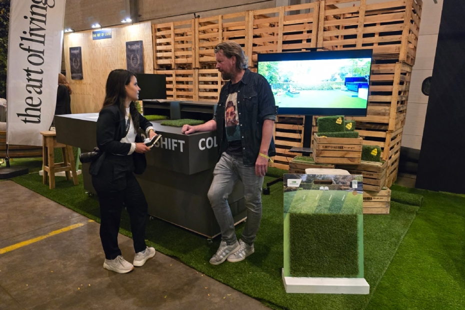 Sander Brouwer van All Season Grass/Kunstgrasboer, staat voor het eerst op MidT. 'Het zijn gewoon leuke dagen om het seizoen meekleurende kunstgras te promoten...!' Willemijn van Iersel vraagt hem uiteraard het hemd van het lijf.