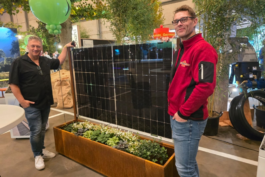 Marcel Donker en Rogier van Oosterzee van Richard Brink. Bekend van de drainagegoten van staal. Oerdegelijk en altijd mooi. Nieuw van Richard Brink: cortenstaal bloemenbak met een windscherm van zonnepanelen. Binnenkort meer te lezen in De Hovenier.