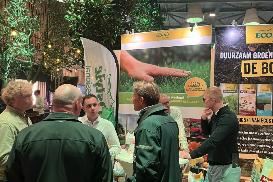 Drukte bij EcoStyle. 'Tof om te zien hoe het bewustzijn over een gezonde bodem toeneemt en dat zowel professionals als tuinparticulieren duurzamere keuzes willen maken.'