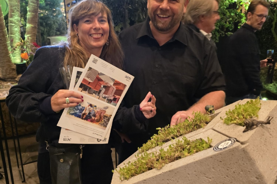 Martin geanimeerd in gesprek met Tynke van den Heuvel van Studio Wae over de nieuwe sedum tegel. Passend in het bekende Studio Wae design.