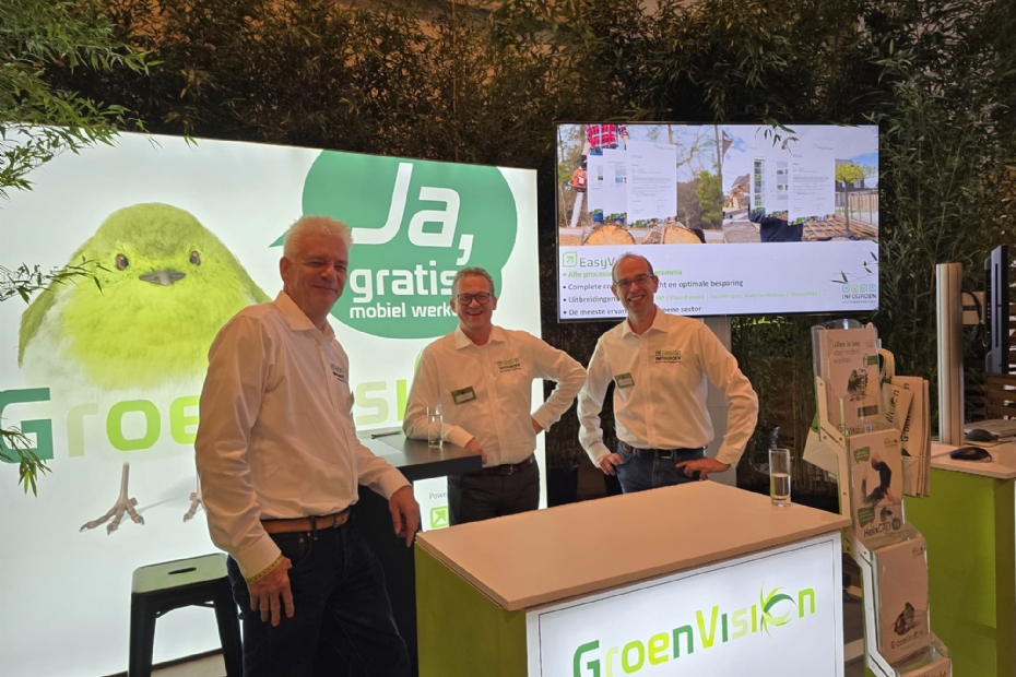John Willemsen, Frank Raanhuis en Jan Pieter Kalisvaart. Eerste Meesters in de Tuin voor Jan Pieter, die net een maand bij Infogroen werkt. Hij noemt het een gezellige en betrokken vakbeurs.